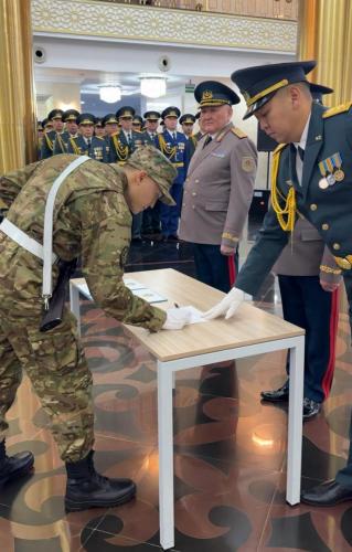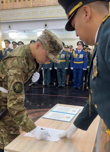 В ходе торжественной церемонии начальник университета генерал-майор А. Мустабеков отметил, что военная присяга является ярким проявлением верности Родине, народу и Конституции, он пожелал молодым военнослужащим строго соблюдения воинской дисциплины, совершенствование профессиональных знаний и навыков, добросовестной службы в обеспечении безопасности страны.